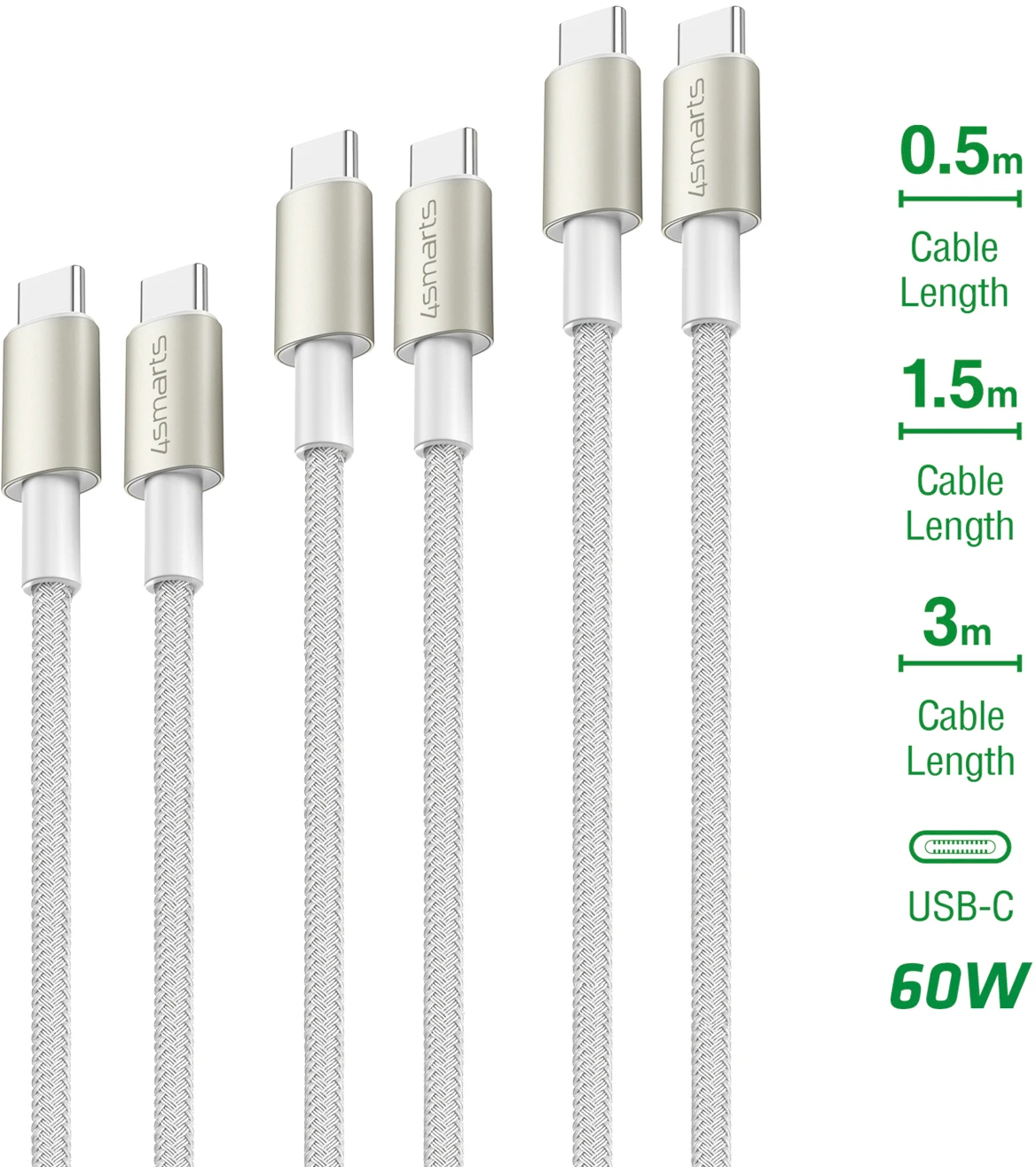 4Smarts USB-C auf USB-C Kabel PremiumCord 60W 3er Set 0,5 m + 1,5 m + 3 m Weiß / Silber