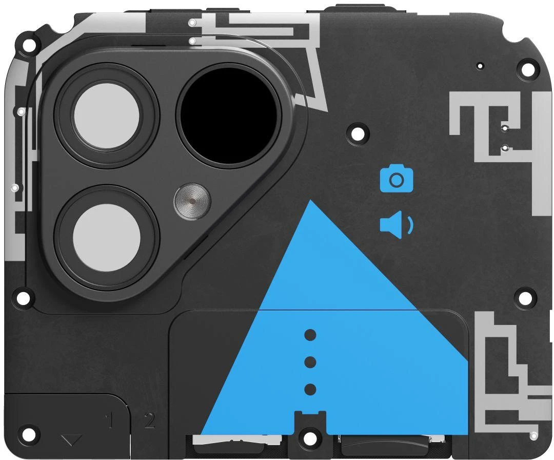 Die Top-Einheit des Fairphone 5 enthält den SD-Kartensteckplatz für erweiterten Speicher sowie den SIM-Kartensteckplatz. Erstmals kannst du diese Komponenten einzeln austauschen, falls sie beschädigt sind. Außerdem gibt es einen TOF-Sensor für die Bildnachbearbeitung. Nicht zuletzt befindet sich in der oberen Einheit auch der Kamerablitz, der zudem als eigenständige Taschenlampe verwendet werden kann. Alle Einzelkameras für das Fairphone 5 sind separat erhältlich.