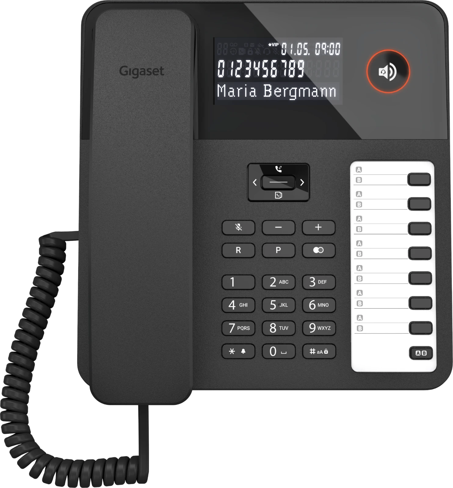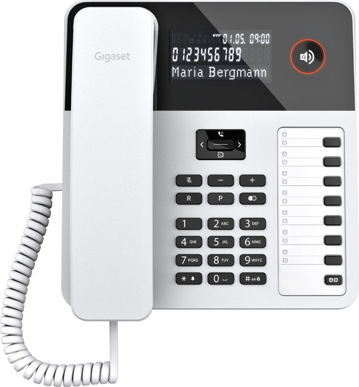 Was am Gigaset A690 zuerst ins Auge sticht, dürfte das große, beleuchtete Schwarz-Weiß-Grafik-Display sein. Das hat viele Vorteile: Der starke Kontrast von schwarzer Schrift auf weißem Hintergrund oder die große Ziffernanzeige im Wählmodus zielen bewusst darauf ab, das Bedienen noch einfacher für Sie zu machen. Zusätzlich sorgt eine ergonomische Tastatur mit beleuchteten Tasten und intuitiver Handhabung für hohen Komfort beim Telefonieren.